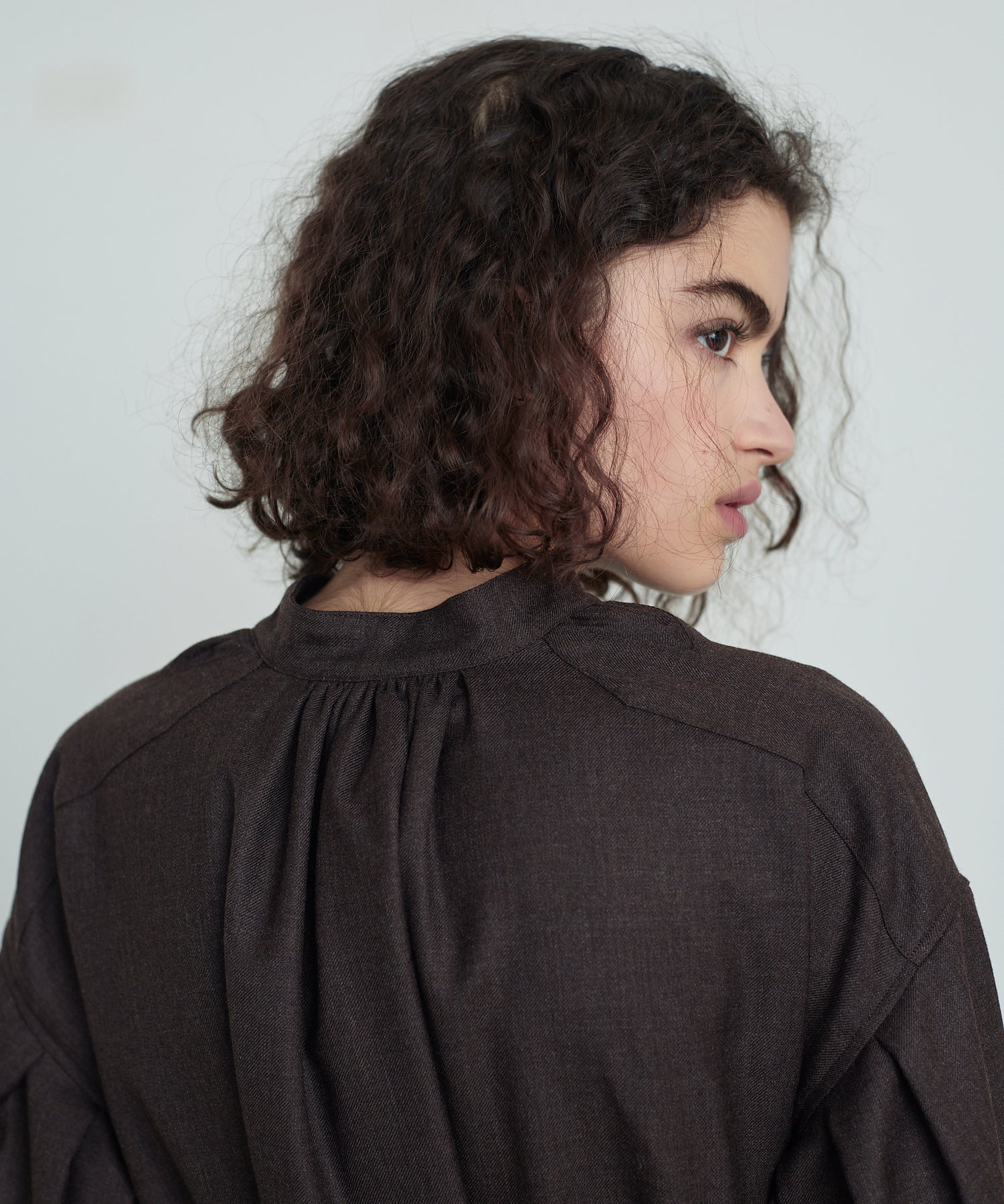 このドレスの大きな特徴は贅沢に生地を使い、肩まわり・ネックライン・袖口にたっぷりとギャザーを施していること。