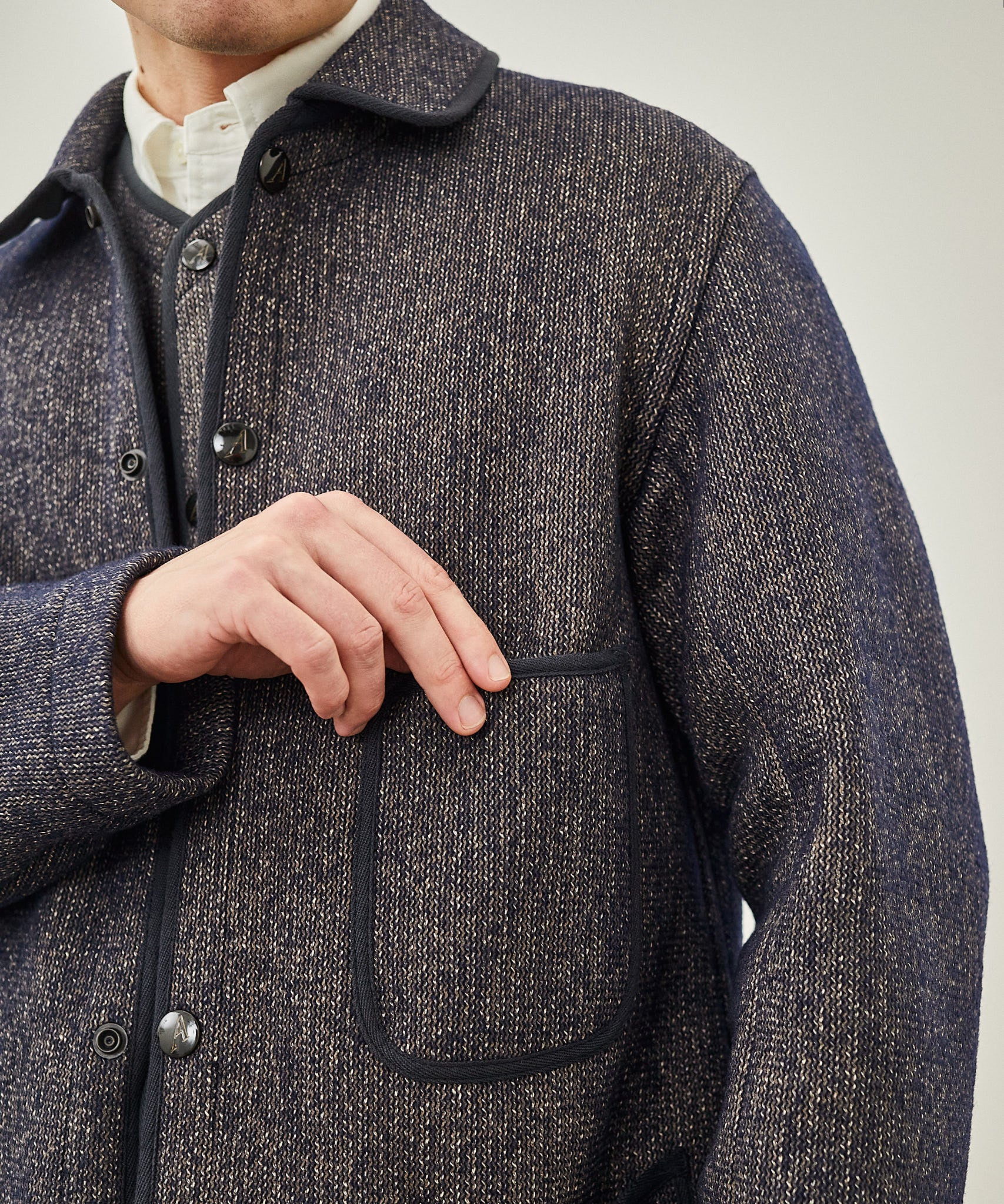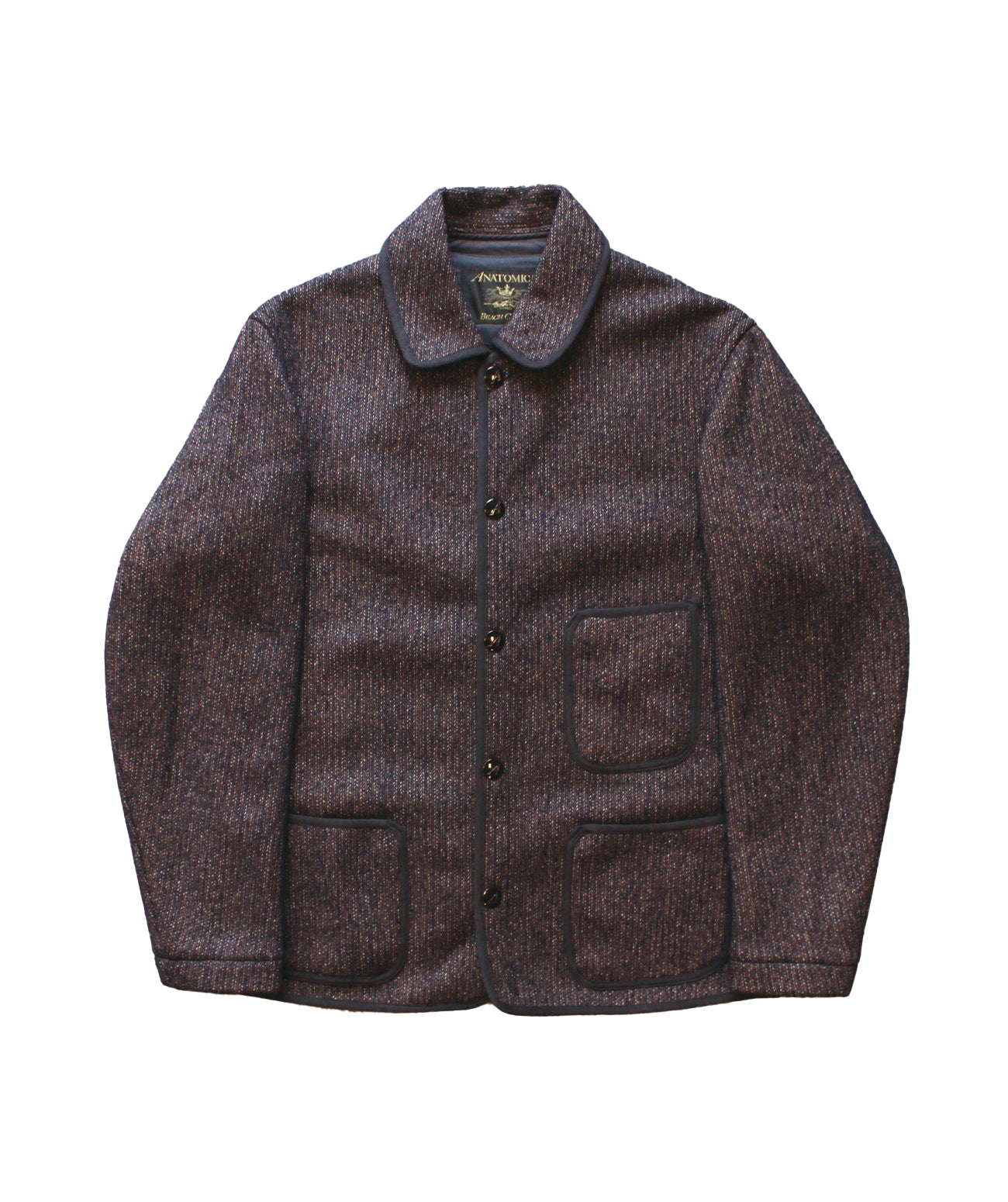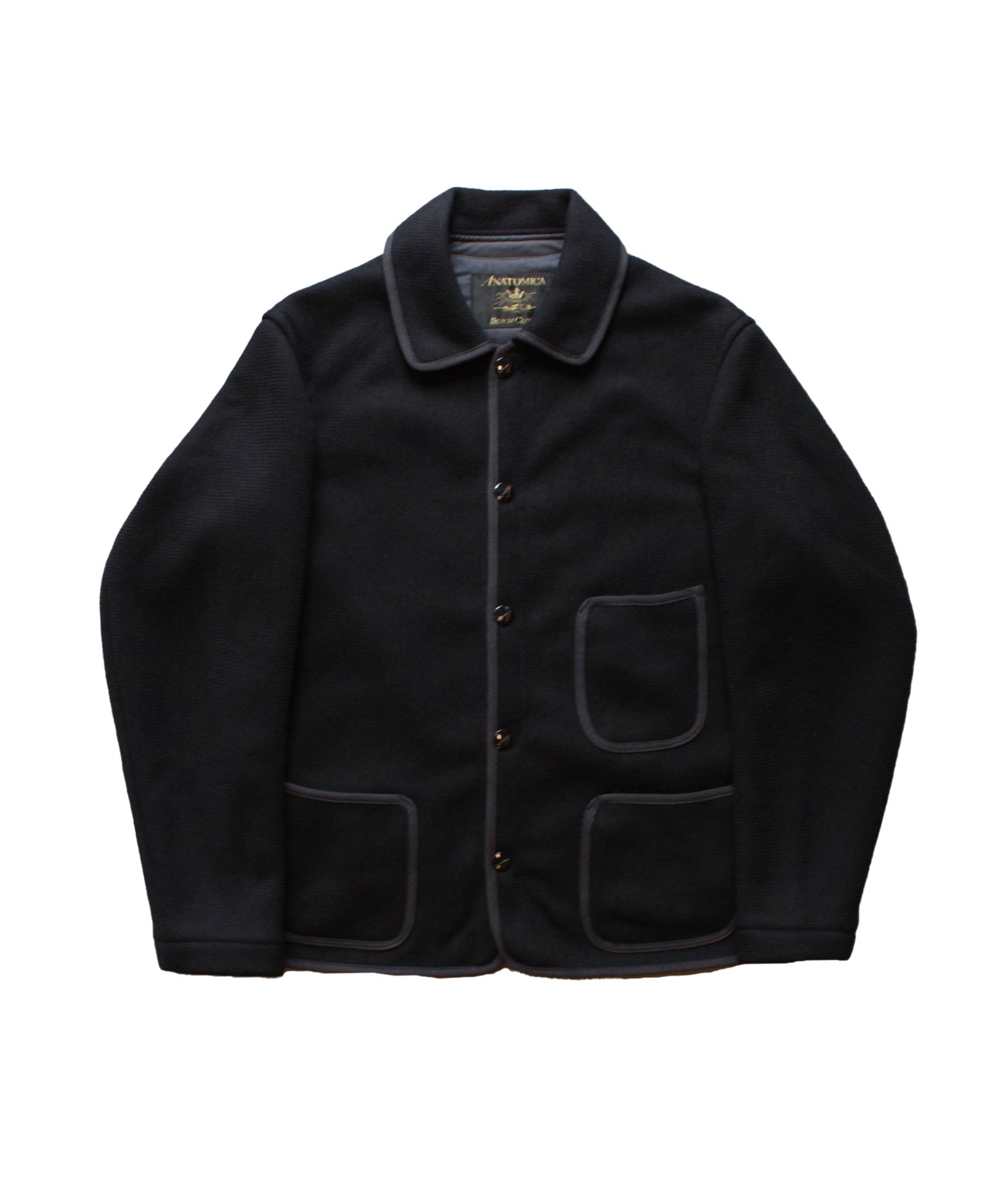 アナトミカのAの刻印が入るオリジナルのドットボタン。身頃裏にはBEACH CLOTHの素材ネームが入っています。