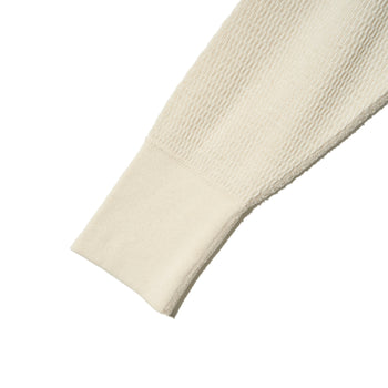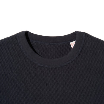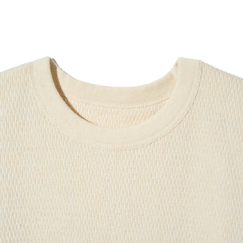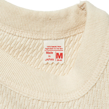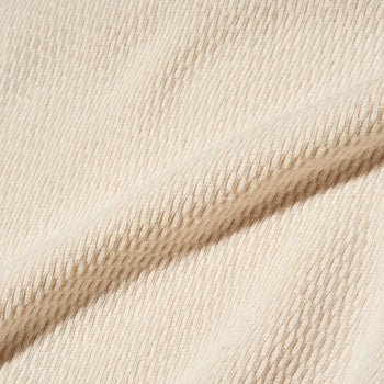 高い保温性を誇り、肉厚で伸縮性を持つ生地を使用しており、非常に暖かく、柔らかな着心地です。ハニカム地と呼ばれる、ワッフル地より古い年代に多く見られる、軍隊でも採用される正統派の生地です。。