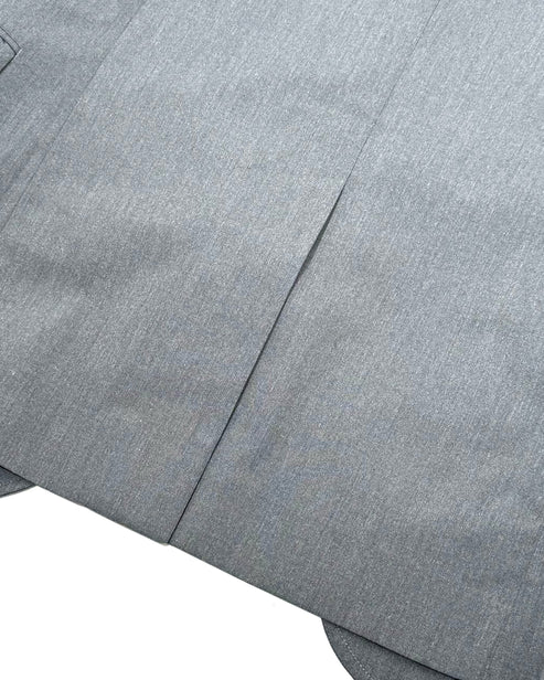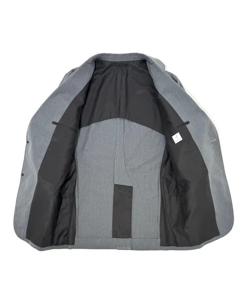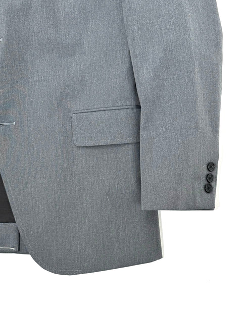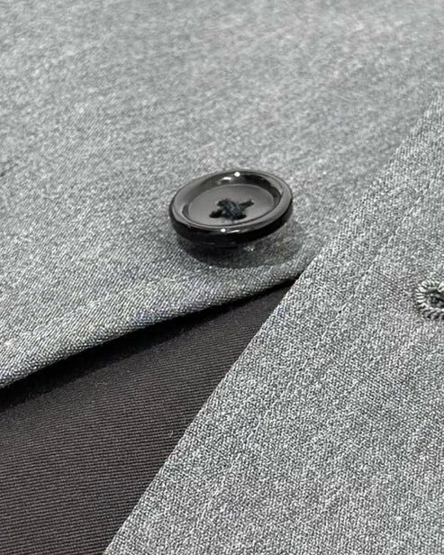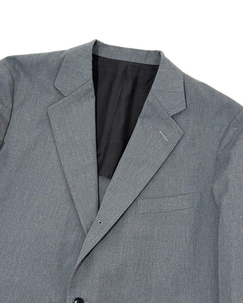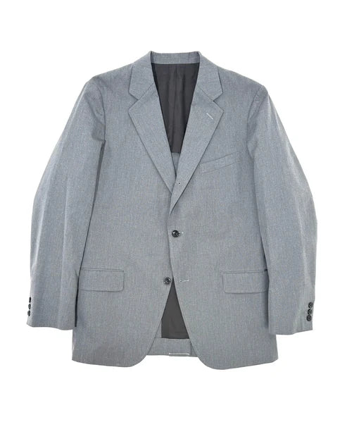 3つボタン、ナチュラルショルダー、細めのラペルのクラシックな扱いやすい形。